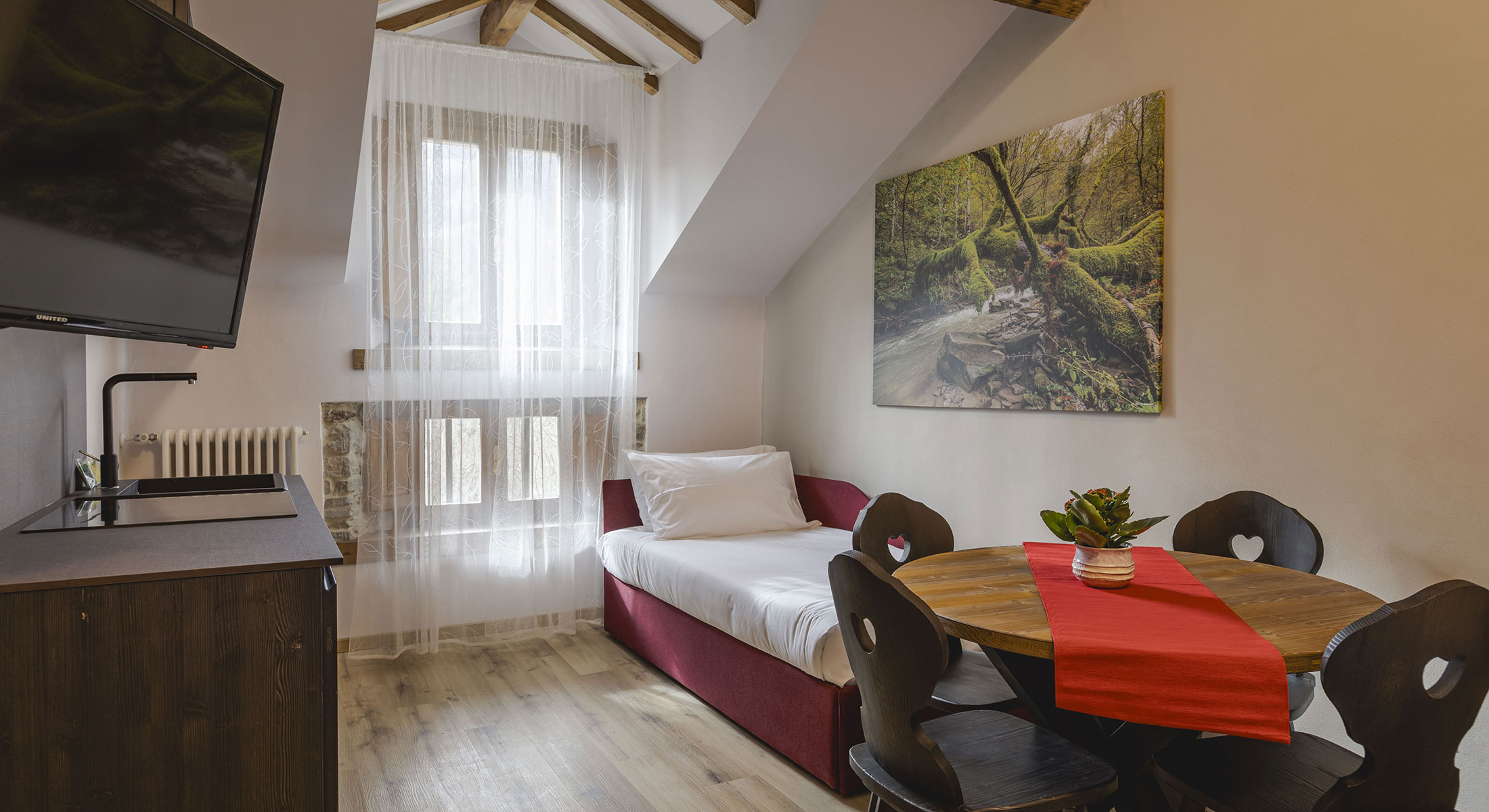Located on the third floor, this charming accommodation features ceilings with original spruce beams in the attic, creating a cozy and authentic atmosphere.